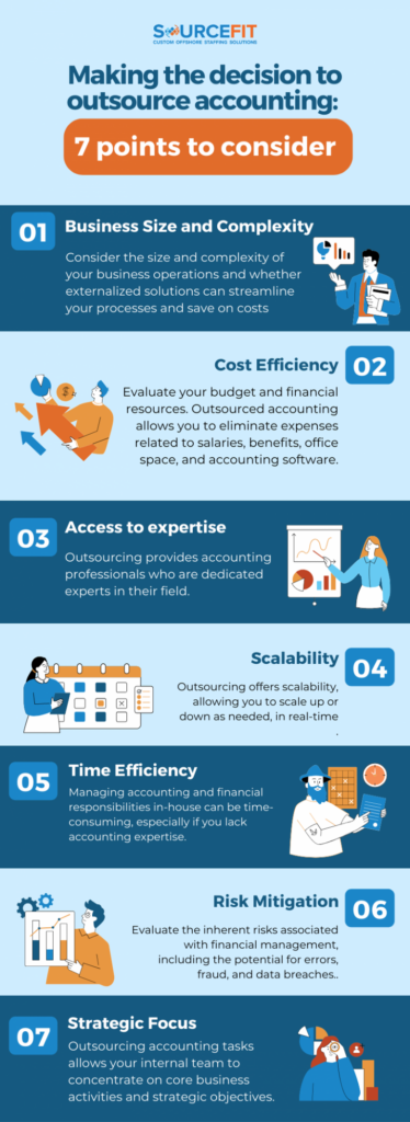 Making the decision to outsource accounting services means assessing factors such as business size, cost efficiency, access to expertise, scalability, time efficiency, risk mitigation, and strategic focus.